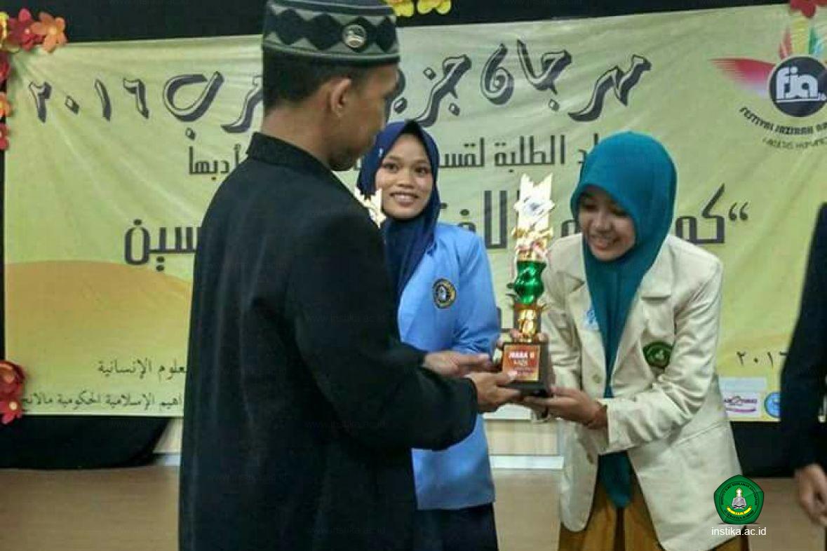 Malang - Instika - Siti Zakia Aji, mahasiswi Instika jurusan Pendidikan Bahasa Arab (PBA), meraih juara 2 Lomba Baca Puisi Bahasa Arab dalam Festival Jazirah Arab Tingkat Nasional di UIN Maulana Malik Ibrahim Malang. Festival ini berlangsung sejak Selasa-Minggu (1-6/11/2016) yang lalu.