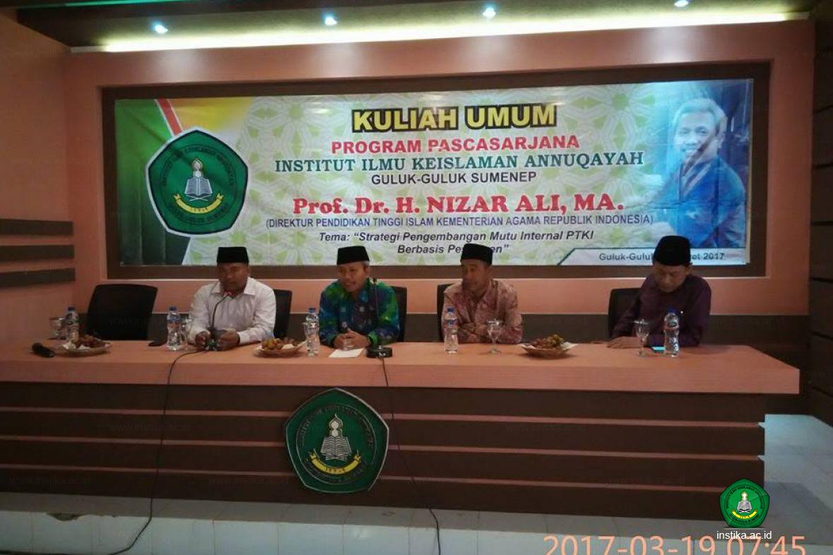 Guluk-Guluk - Instika - Peningkatan mutu harus menjadi prioritas dalam pengembangan perguruan tinggi, terutatama yang berkaitan dengan akreditasi. Begitulah salah satu pembahasan utama yang disampaikan oleh Prof. Dr. H. Nizar Ali, MA., Selaku Direktur Perguruan Tinggi Islam Kemenag RI dalam acara Kuliah Umum yang dilaksanakan oleh Program Pascasarjana Institut Ilmu Keislaman Annuqayah, Ahad 19 Maret 2017.