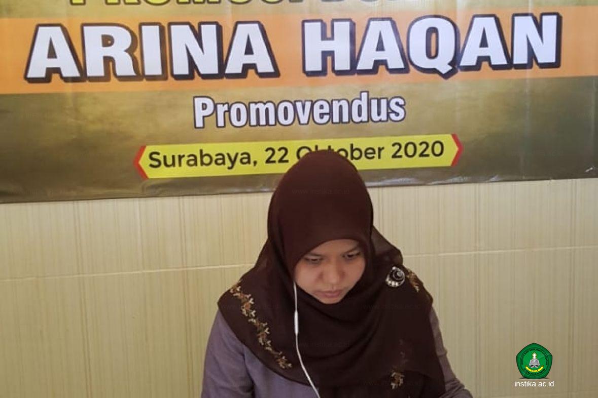 Arina Haqan MEI dikukuhkan sebagai doktor setelah sukses mempertahankan disertasinya di hadapan para penguji pada Ujian Terbuka Promosi Doktor Program Pascasarjana UIN Sunan Ampel Surabaya, Kamis (22/10/2020), secara daring.