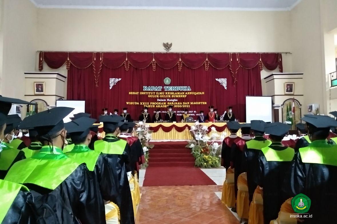 Drs. KH. Ah. Syamli, MPdI. menyampaikan bahwa proses pengukuhan peserta wisuda INSTIKA dilaksanakan dua kali. “Untuk yang putra dilaksanakan pada hari ini, sementara yang putri akan dilaksanakan besok, 28 Oktober 2021,” katanya. Dalam sambutannya, rektor INSTIKA ini menyampaikan, pemisahan antara putra dan putri dilandaskan pada nilai-nilai pesantren yang diajarkan muassis dan pengasuh Annuqayah.