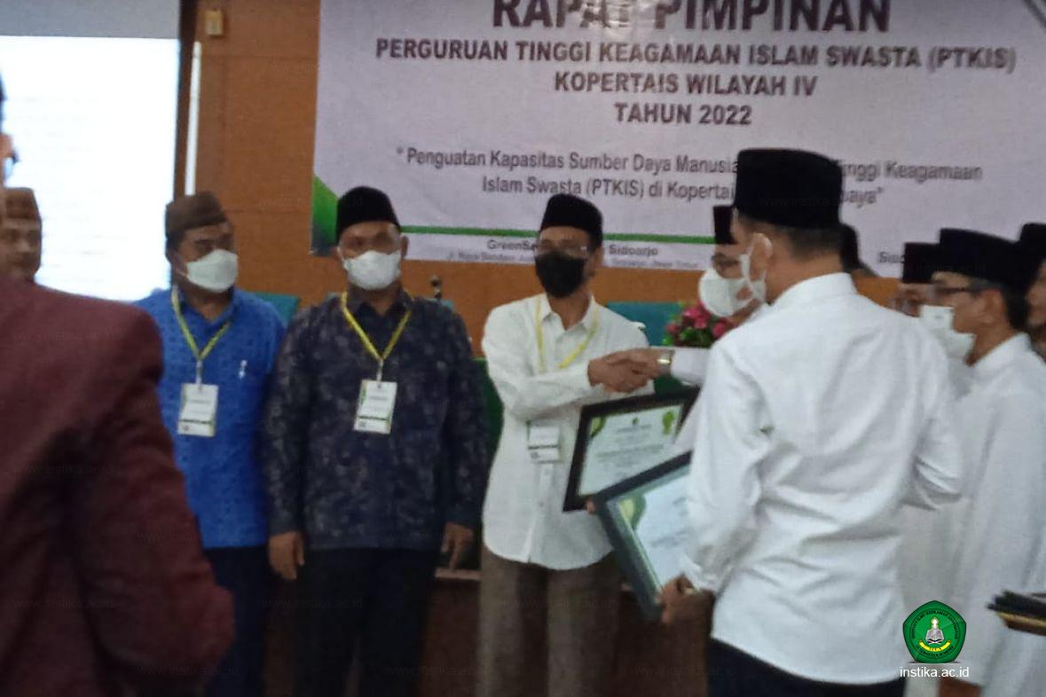 Prof. Akh. Muzakki, selaku Koordinator Kopertais Wilayah IV dan juga Rektor Universitas Islam Negeri Sunan Ampel (UINSA) Surabaya memberikan langsung penghargaan itu kepada Rektor INSTIKA, Drs. K.H. Ah. Syamli, M.Pd.I.