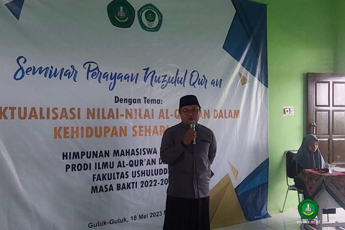 Pemateri dalam seminar Nuzulul Qur'an kali ini adalah Ustaz Ainul Fadhal Romli. Dalam pemaparannya, Ustaz Ainul Fadhal menyampaikan pentingnya memahami Al-Qur'an dan mengamalkannya dalam kehidupan sehari-hari, tidak hanya mempelajari teori dan keilmuannya saja. "Dahulukan Na'budu baru Nasta'iin sebagaimana yang terdapat dalam Qur'an surah Al-Fatihah ayat 5," katanya.